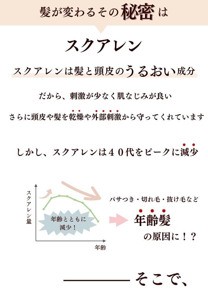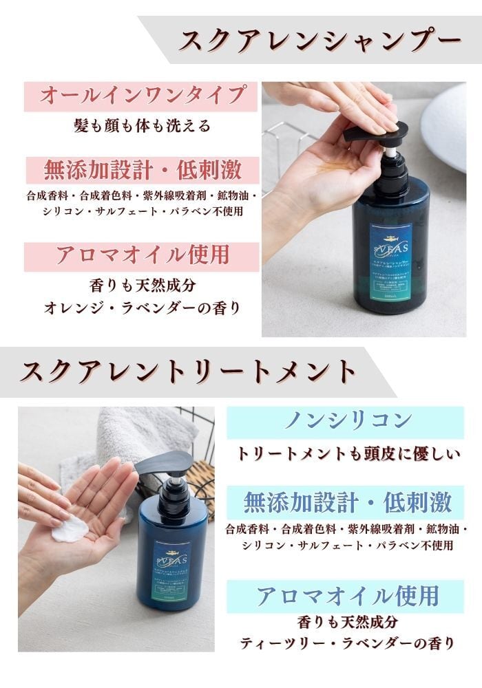 業界初!「スクアレン」と「トコトリエノール」の独自レシピ。年齢と共に頭皮と髪から減少してしまう「スクアレン」を補って潤う新発想の天然アミノ酸スキンケアシャンプー&トリートメント。「スクアレン」×「トコトリエノール」で頭皮環境を整え、艶のある美しい髪へ。さらに、11種のアミノ酸が頭皮と髪に潤いを与えます。